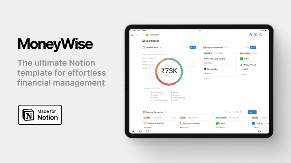 MoneyWise is your go-to Notion template for effortless financial management, helping you track expenses, categorize spending, and project future goals with ease.